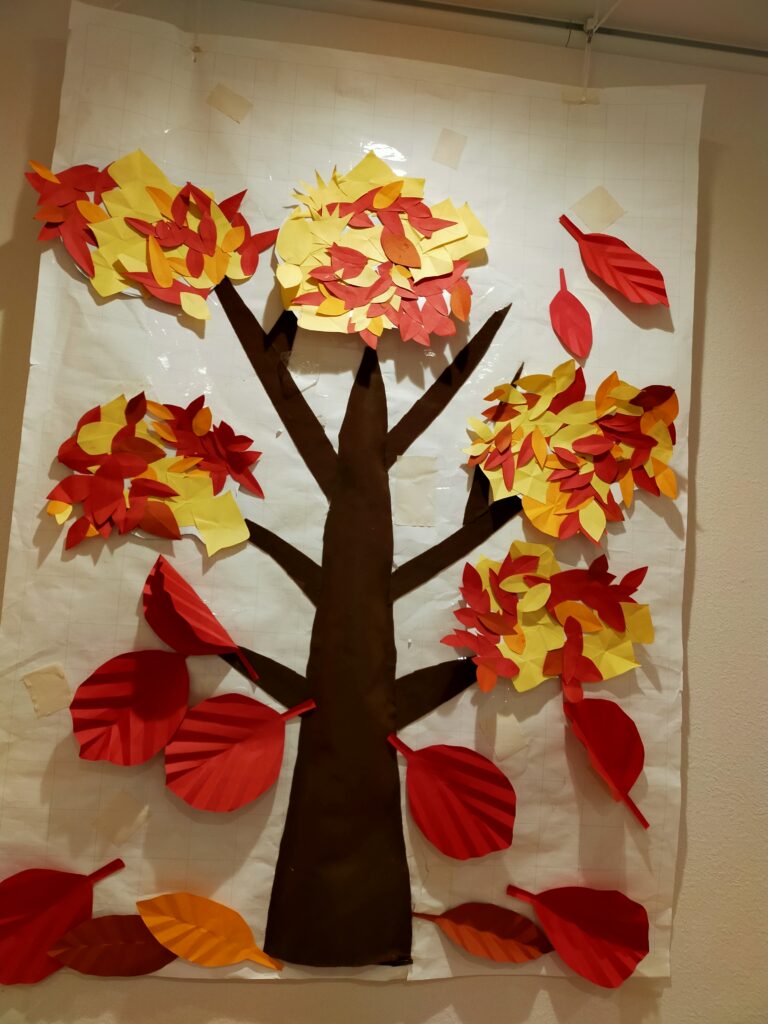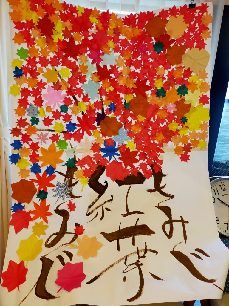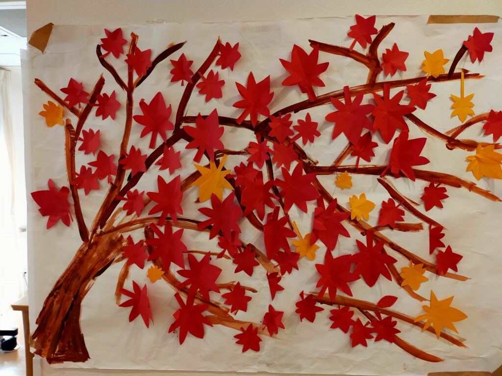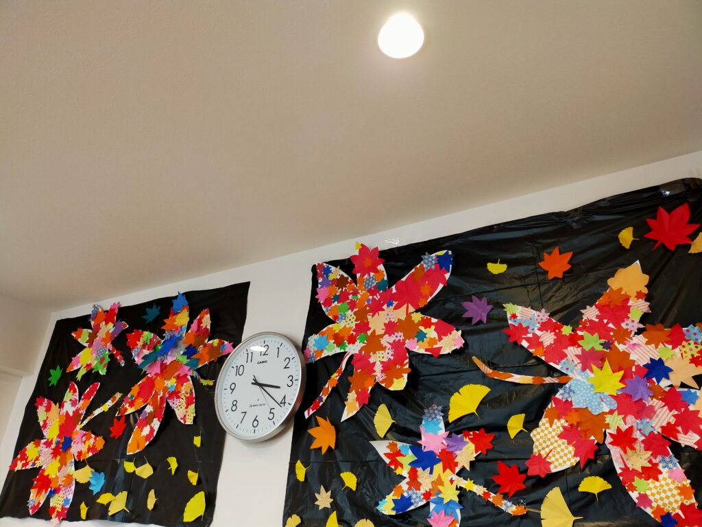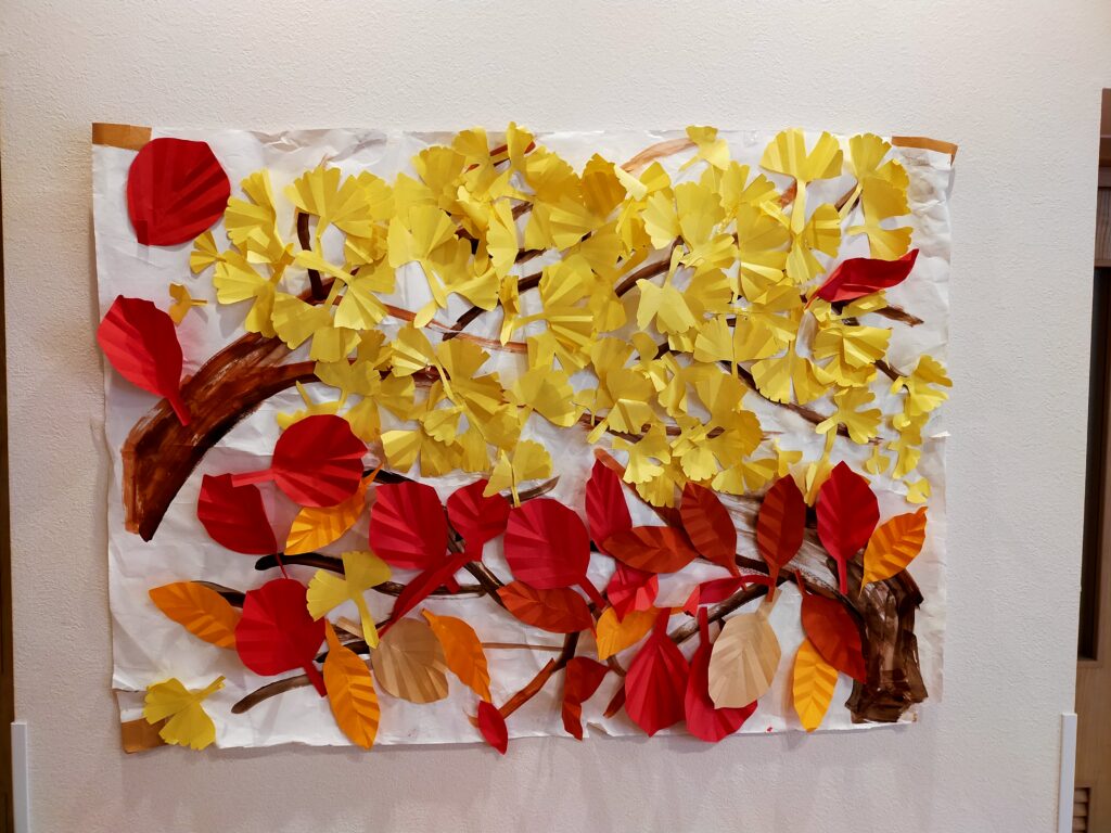 いつも、ありがとうございます。「けやきの杜」です。 フロアが紅葉してます。利用者様が一生懸命貼って下さいました。