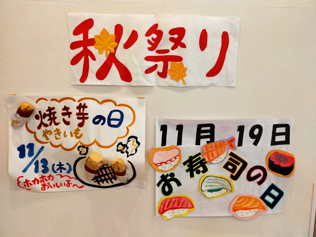 来月は秋祭りです「焼き芋」に「お寿司の日」お寿司は目の前で握ってくださいます。